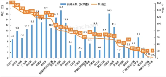 从省份分布看,2025年全国30个省/直辖市/自治区均发布了医疗设备更新招标公告,共计2156个项目。北京市以152个项目数领跑全国,四川、甘肃、广东等省份项目数也超110个;山西预算金额最高,达17.4亿元,贵州、河南、海南等省份预算金额也相对较高。