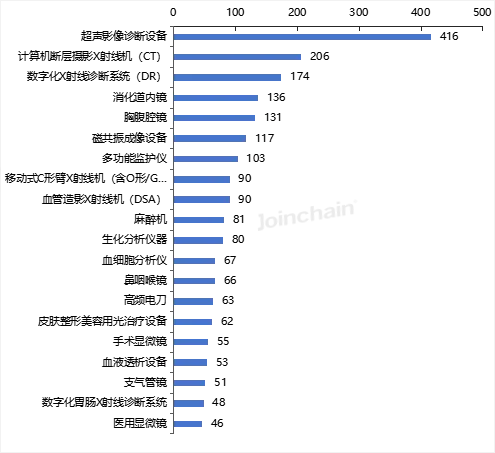 从产品类别来看,2025年全国设备招标公告覆盖品种共350种。采购频率最高的五类产品分别是:超声、CT、DR、消化道内镜和胸腹腔镜。其中超声设备项目数断层领先,共计416个;其次是CT设备206个。