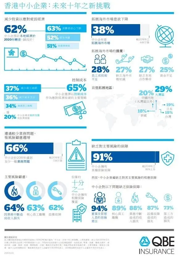 昆士兰保险香港为昆士兰保险集团所属之成员公司,于去年底进行了一项题为“中小企:未来十年之新挑战”之独立问卷调查,共访问了400间中小企。香港共有约340,000间中小企,为本地私营界别提供约四成半就业机会,因此研究结果别具参考价值。