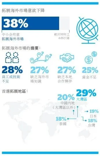 面对经济前景欠佳,营商气氛低迷,香港中小企采取了更保守的策略。中小企扩展海外市场的意欲于年内下跌六个百分点至38%,原因包括:员工或技术不足(28% ),缺乏海外市场知识(27%),缺乏本地合作伙伴(27%),资金不足(25%)及不熟悉海外法规(24%)。对于有意扩大香港以外市场的中小企而言,首选的五个地区是大湾区(29%),中国内地(不包括大湾区)(20%),日本(19%),台湾(18%)和泰国(18%)。