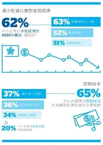 该项研究进行之时,新冠状病毒疫情尚未爆发。当时有为数不少的香港中小企认为2019年销售疲弱(44%)和经济放缓(68%),明显比2018年的预期较差(分别是26%和54%)。同时,他们对2020年前景亦不乐观,分别有45%和62%的中小企预计2020年的生意和整体经济将面临下行压力,原因是消费者信心下降(63% ),贸易争议(52%)和旅游业衰退(51%)。