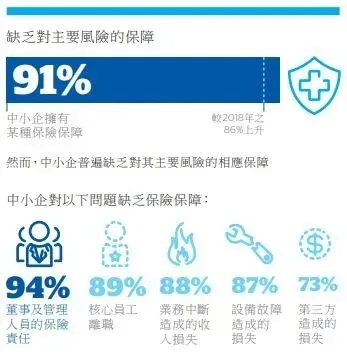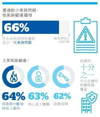 中小企对各项风险忧心趋增,包括因业务中断造成的收入损失(64%),设备故障(62%),因不合格产品或服务而对第三方的责任(61%),因事故而对第三方的责任(58%),财产损失(56%)和董事及管理人员所面临的责任(46%)等。尽管有更多中小企投保(从2018年的86%上升到2019年的91 %),但只有少数中小企拥有对应最迫切问题的合适保障,使他们仍受业务中断风险威胁。