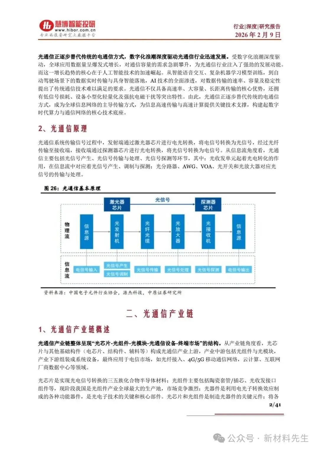 - 核心定义:光通信是以光信号为信息载体、光纤为传输介质的通信系统,包含光芯片、光模块、光纤光缆等基础构件,应用于电信和数据中心市场,是技术 / 人才 / 资金设备密集型产业。