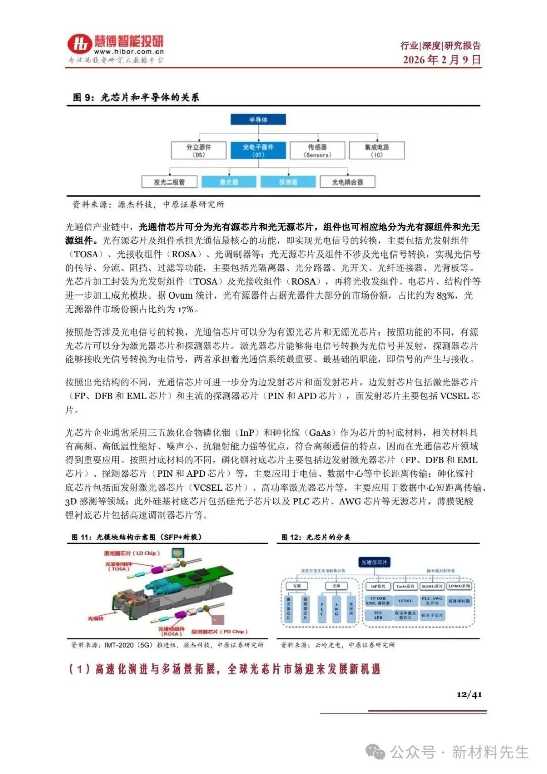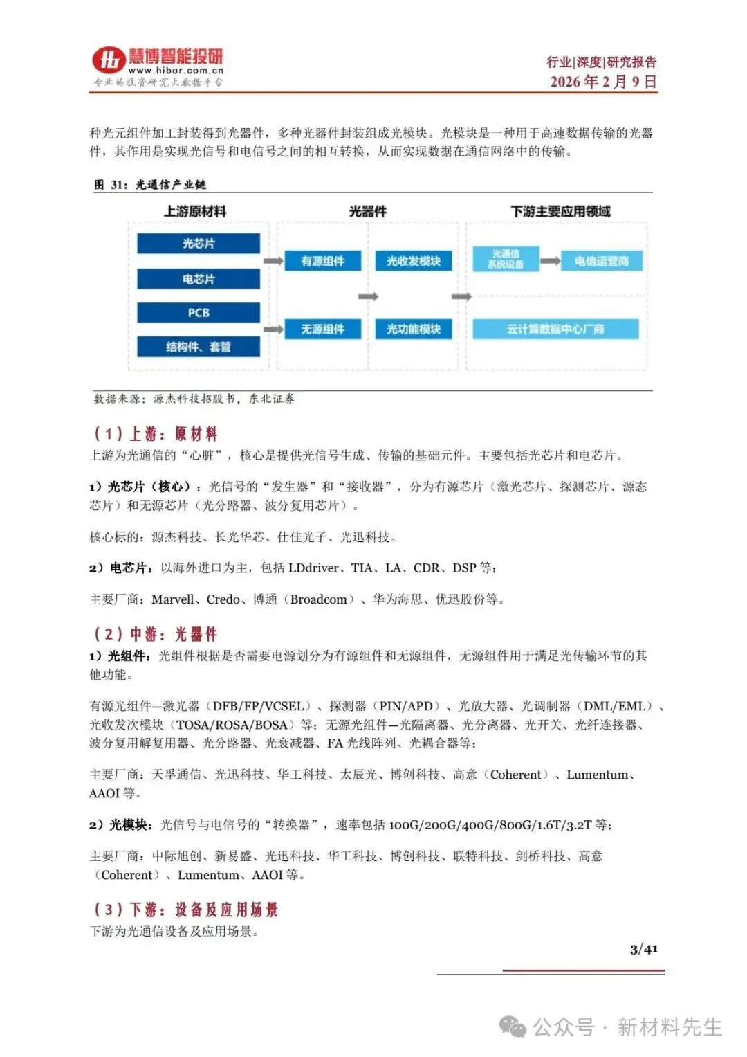 产业链呈上游原材料 - 中游光器件 - 下游设备及应用的垂直结构,价值核心向光、电芯片集中,形成 “芯片定性能、封装定可靠性” 的格局。