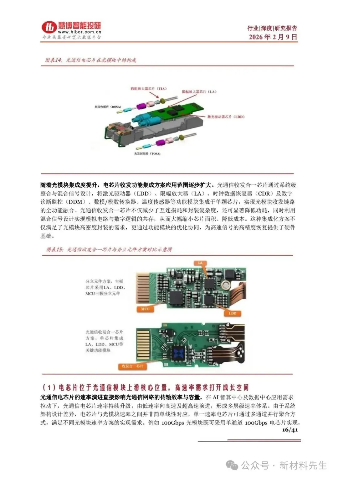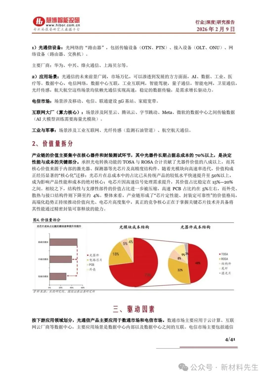 - 价值量拆分:光器件长期占总成本70% 以上,其中 TOSA/ROSA 贡献光器件价值 80% 以上;光芯片(50%+)、电芯片(15%-20%)为核心价值项,高速 PCB(5%)、结构件(4%)价值占比低。
