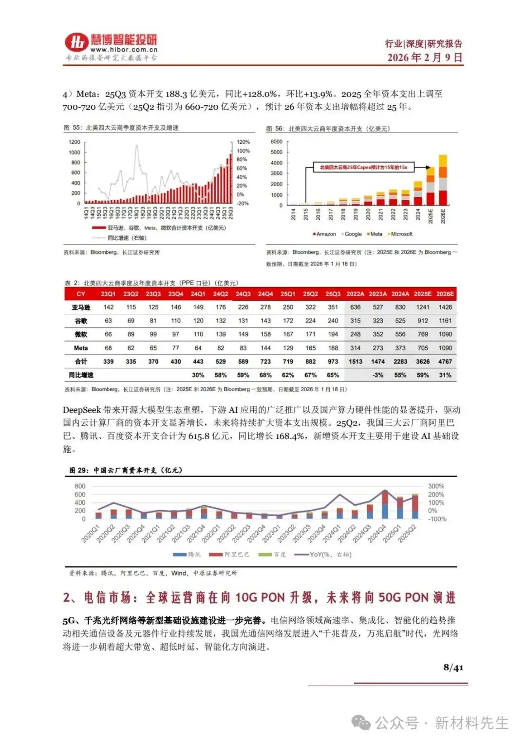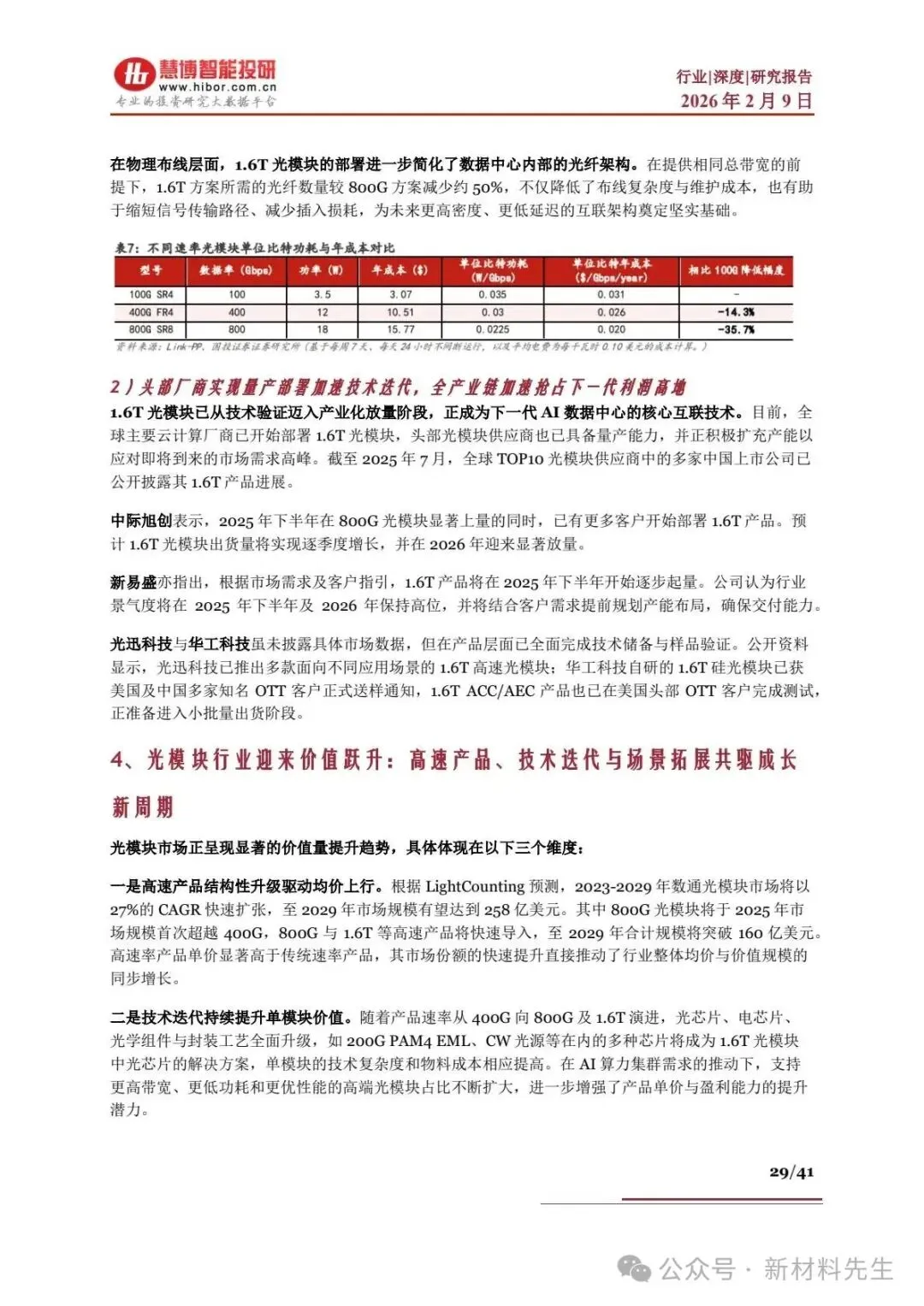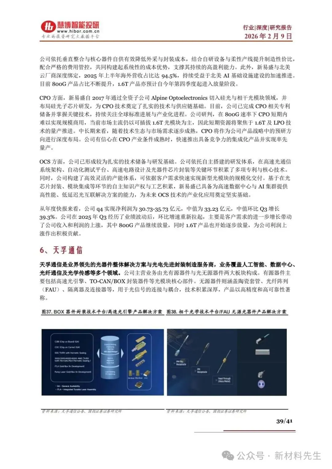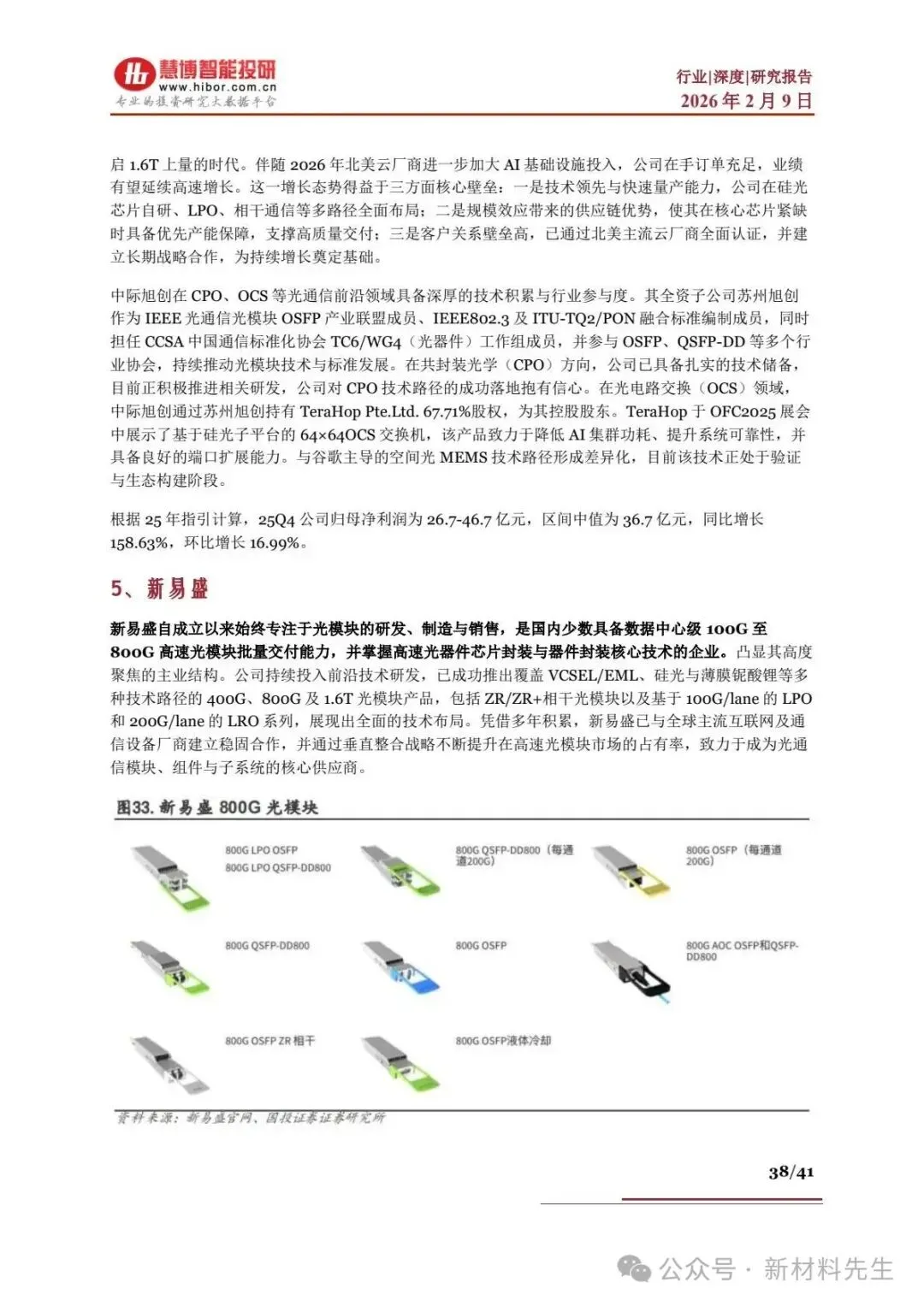 - 新易盛:800G 占比提升,1.6T 25Q4 起量,海外营收占比 94.5%,25Q4 净利润中值33.23 亿元,环比 + 39.3%,掌握 CPO 核心专利。