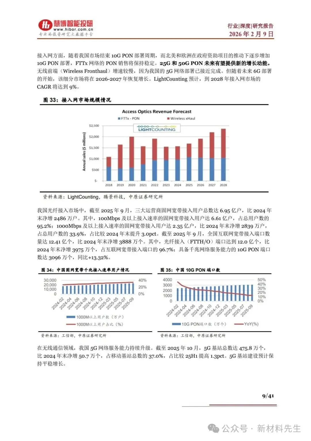 - 光纤接入升级:截至 2025 年 9 月,国内千兆宽带用户2.35 亿户(占比 33.9%),10G PON 端口3096 万个,同比 + 13.32%;全球向 10G PON 升级,未来 50G PON 端口 2024-2028 年CAGR200%。