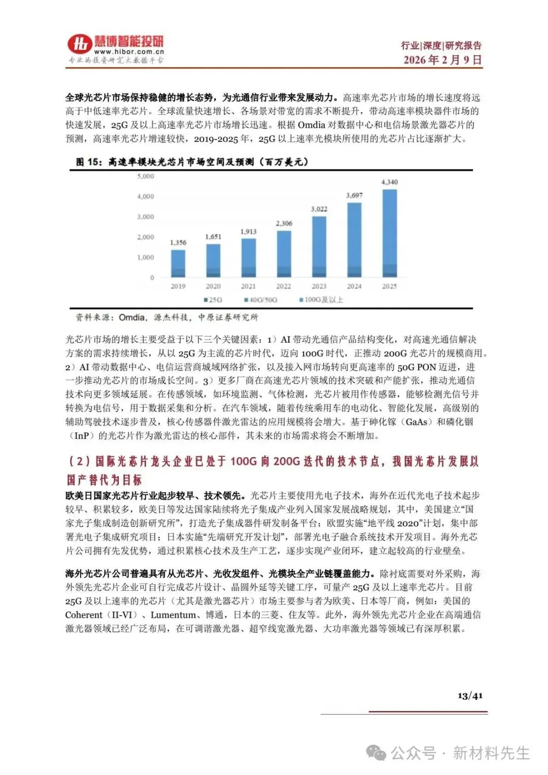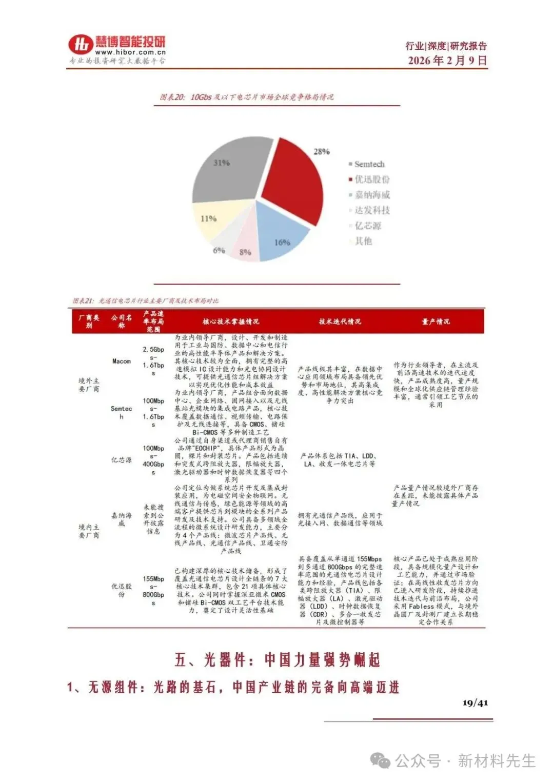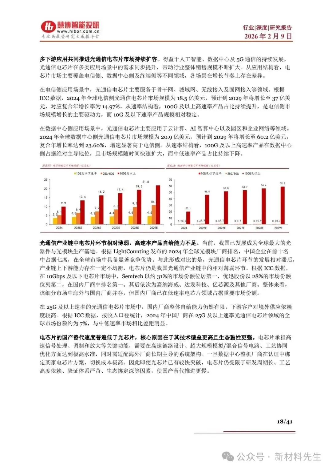| 电芯片 | 海外垄断(Macom、Semtech),高端技术壁垒高 | 10G 及以下国内占 28%(优迅股份),25G 及以上全球份额仅7% | |