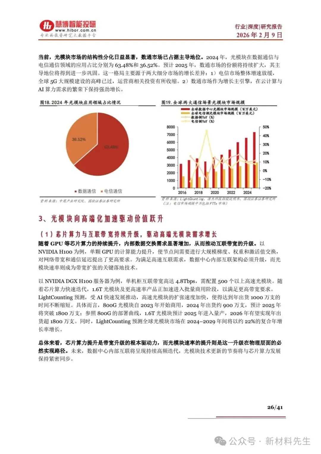 光通信需求分为数通市场和电信市场,其中数通市场(AI 数据中心)是行业增长核心驱动力,电信市场呈稳健升级态势。