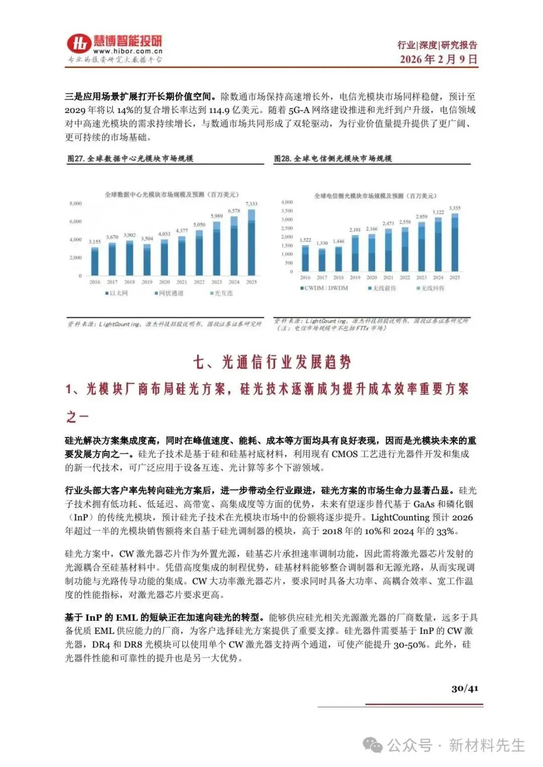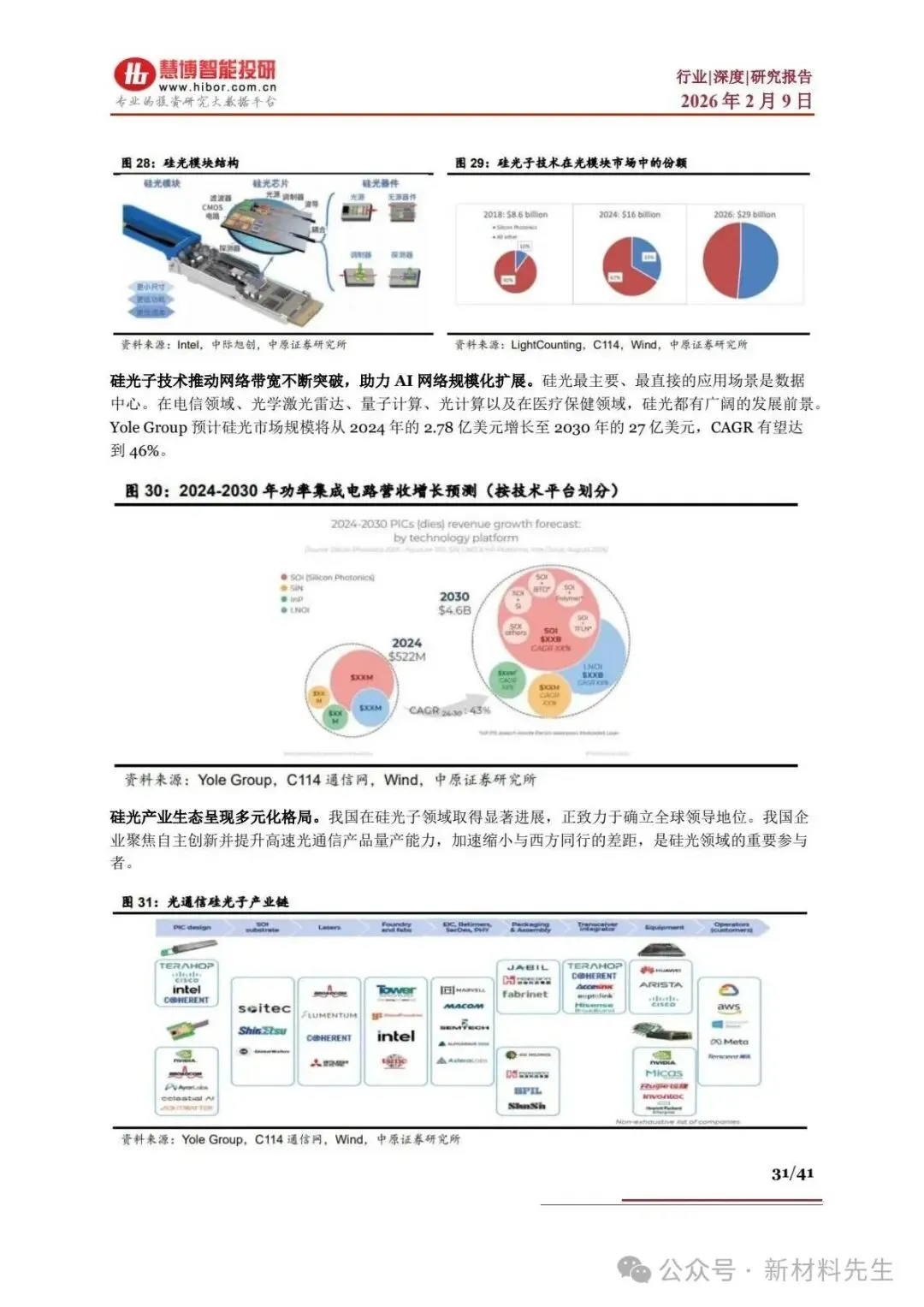 - 优势:低功耗、高集成度、低成本,可替代传统 GaAs / 磷化铟光模块,2026 年超 50% 光模块销售额来自硅光方案。