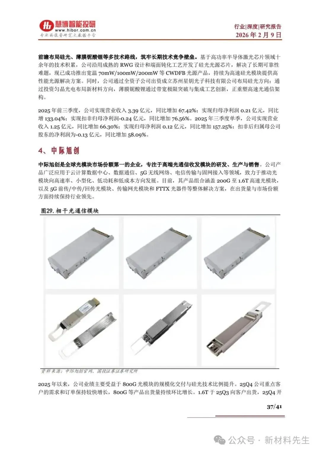 - 中际旭创:全球市场份额第一,800G 放量,1.6T 25Q3 出货,25Q4 归母净利润中值36.7 亿元,同比 + 158.63%,布局 CPO/OCS 技术。