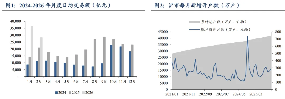 权益市场持续走强,2025年市场日均股基交易额为20538亿元,同比增长70%,四季度日均股基交易额24322亿元,同比增长18%,环比下降2%。截至2026年2月,2026年以来全市场股基成交额达到3.29万亿元,同比增长89%。