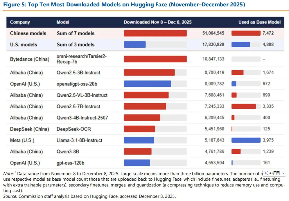 中国在人工智能领域选择全力推行开源模式。多数国内实验室不仅公开模型源代码和参数权重,其高端产品的使用费用也远低于国际竞争对手。这种策略加速了全球对中国人工智能技术的接纳进程,形成了良性循环:技术的广泛采用推动模型迭代升级,而持续的技术应用又进一步促进技术普及。截至本文发布时,阿里巴巴旗下Qwen模型已在HuggingFace平台上构建起规模最大的模型生态系统,衍生出超过10万个子模型。这种开放的生态系统使中国能够在计算资源受限的情况下,持续在前沿领域实现创新突破。中国实验室已成功缩小与西方顶尖大型语言模型之间的性能差距,并在架构设计和训练方法方面取得重大进展,相关成果现已成为行业标准。开放模型的激增为人工智能领导地位开辟了替代路径。中国的战略重点在于通过在制造业、机器人技术和科研领域部署具身人工智能(embodiedAI),实现数据整理与优化。这些领域广泛使用的专业现实数据可能形成优势,而美国专有模型即便在基准测试中保持技术优势,也难以轻易复制这些优势。中国开放型AI模型战略与其制造业优势形成良性循环。欧盟委员会2025年年度报告指出,中国工业基础在相邻领域形成了“相互联动的创新飞轮效应”。开放模型通过推动低成本AI技术在工厂、物流网络及机器人领域的广泛应用,加速了这一发展态势,从而在现实世界中产生显著效益。技术——2020年,随后是2022年的“20项数据措施”以及2023年国家数据管理局(NDA)的成立,以实现这一愿景。中国在将这一愿景转化为实践方面具有结构性优势:无与伦比的制造业基础、完善的物联网(IoT)和5G基础设施,以及积极补贴实体经济领域人工智能应用的政策体系。由此形成与第一反馈循环并行的第二反馈循环——广泛的工业部署将数据反哺模型优化,而模型优化又推动更复杂的部署应用。正是这两个循环(数字与物理)的交汇点,赋予了中国开放战略复合驱动力,同时也对美国人工智能领导地位构成了最严峻的长期挑战。图5:HuggingFace平台上下载量前十的模型(2025年11月至12月)注:*数据范围为2025年11月8日至12月8日。大规模模型指参数量超过30亿的模型。以各模型为基础模型的模型数量统计包含重新上传至Hug-ging Face平台的模型,具体涵盖微调模型、适配器(即通过额外可训练参数进行微调)、二次微调、模型合并以及量化技术(一种降低内存占用和计算成本的压缩技术)。来源:委员会工作人员基于Hugging Face进行的分析,访问日期:2025年12月8日。第二环路:部署生成数据