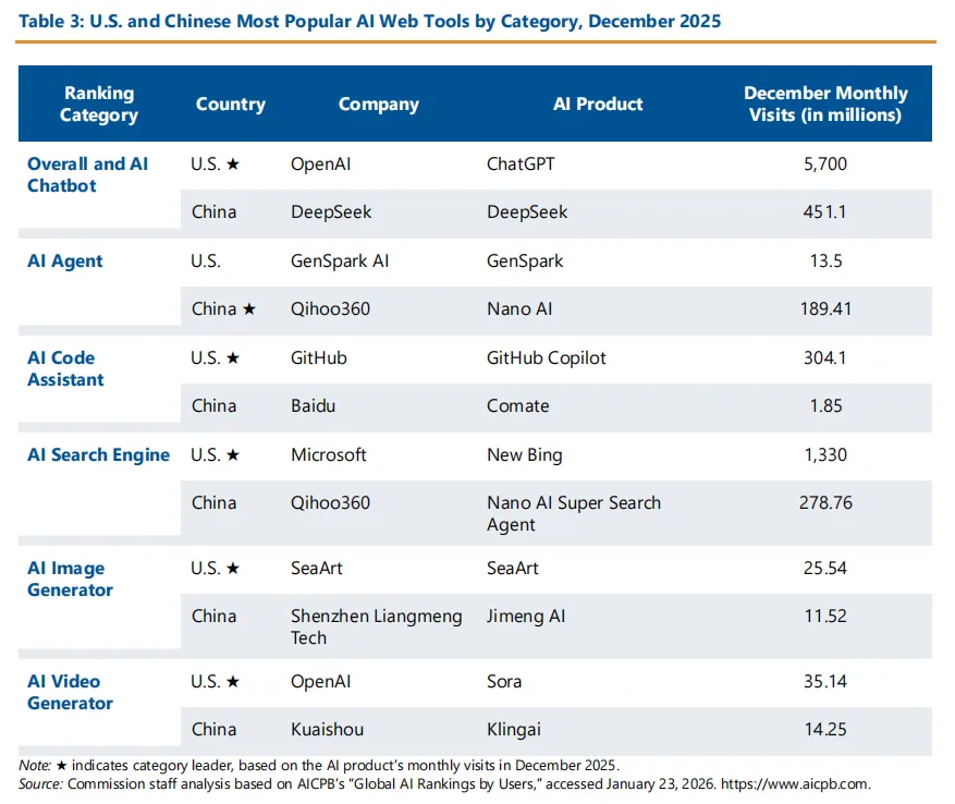 现有数据显示,中国在推广开放模型方面取得的成功,尚未显著转化为聊天机器人或视频生成等应用的市场份额增长——这些领域本蕴藏着技术进步带来的巨大盈利潜力。利用AI模型驱动应用是技术应用进程中的关键阶段,其战略价值已超越模型性能本身,更在于实际应用中的实用价值与系统集成能力。根据微软对全球各国终端用户人工智能应用情况的评估,中国应用率落后于美国,仅为16.3%,而到2025年下半年将达到28.3%,不过该研究对中国地区的覆盖力度并不均衡。91兰德公司对美国和中国主流大型语言模型(LLM)网站流量的分析同样显示,2025年8月美国模型占据了全球LLM网站访问量的93%。92总部位于中国的全球人工智能产品排名机构AICPB追踪的全球网络流量数据也表明,在多平台汇总的数据中,美国在各类应用场景中仍保持领先地位。93截至2025年12月,美国AI工具在聊天机器人、代码助手、搜索引擎、图像生成器和视频生成器等榜单上均位居榜首,而中国AI工具则处于落后状态(见表3)。人工智能代理公司是一个显著例外,t其中排名前三的企业均与中国存在业务关联,尽管设立注册地仍面临诸多挑战。中国奇虎360旗下的NanoAI在月访问量方面领先总部位于美国的GenSparkAI(见表3)。不过GenSpark由两位百度前高管共同创立。位列第三的95Manus总部设于新加坡,但该公司在中国成立时获得了腾讯的资金支持。据报道,这家人工智能初创企业正接受中国监管部门的调查。清华大学在推动中国具身人工智能(embodiedAI)发展方面发挥着重要作用,引领全国具身人工智能研究论文发表数量。2022年至2025年9月期间发表43篇论文,并于2025年前成立18家公司。WilliamC.Hannas等人,《中国具身人工智能:通向通用人工智能之路》,安全与新兴技术中心,2025年12月,第18–19页。–content/uploads/CSET–Chinas-Embodied-AI.pdf。AI代理是模块化、基于大语言模型(LLM)的系统,专为特定任务自动化而设计。它们与代理式AI(即为用户执行功能的AI模型,例如操作网页浏览器)存在本质区别。RanjanSapkota、KonstantinosI.Roumeliotis与ManojKarkee合著的《AI代理与代理式AI:概念分类、应用与挑战》发表于arXiv,2025年5月15日。可能违反出口限制和其他法规,自2025年12月被Meta收购后。*表3:2025年12月按类别划分的美国与中国最受欢迎AI网络工具注:*标示类别领先者,基于2025年12月该AI产品的月访问量。来源:委员会工作人员根据AICPB《全球用户人工智能排名》进行的分析,访问日期:2026年1月23日。中国模型在电力应用领域相较于美国模型存在滞后现象,这可能由多重因素导致。尽管中国模型性能与美国顶尖模型不相上下且成本显著更低,但出于政治安全考量,开发人工智能应用的企业客户仍可能优先选用美国模型。此外,相较于追踪模型下载量和衍生版本上传量来评估模型普及度,实际应用中对人工智能模型使用情况的量化评估存在较大难度。有关中国商务部对此次收购的调查的更多细节,请参阅Graham Ayres等人,《2026年2月中国公报》,美中经济与安全审查委员会,2026年2月4日。。(有关按模型国籍衡量应用程序使用情况所面临挑战的更多细节,请参见附录II:“应用程序中人工智能采用率测量的挑战”)。尽管目前处于领先地位,美国也不应掉以轻心。中国人工智能企业强调需要改进应用中的模型集成。百度首席执行官甚至认为,中国互联网科技巨头平台的广泛性为开发驱动应用的模型提供了优势,并指出“我们[中国]可能无法匹敌谷歌和OpenAI在模型训练上的投资,但我们更接近应用层面。”96如果中国科技巨头成功缩小这一差距,上述记录的复合动力学效应可能从模型开发延伸至应用层。与此一致,百度、阿里巴巴、腾讯和字节跳动目前正在努力整合各自的基模型、开发者基础设施、企业生产力工具、营销创意平台及消费应用。美国应对措施