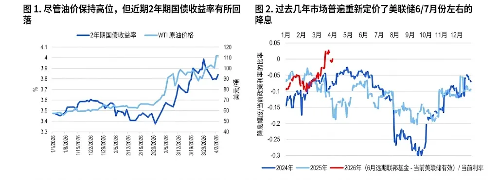 3-时薪同比增速放缓至3.5%,招聘意愿走弱,职位发布下滑,雇佣率跌至疫情低位。花旗指出,当前的招聘率已降至2010年初以来的最低水平,私营部门的雇佣需求实际在走弱 。1、3 月整体 CPI 环比 + 0.9%(同比 + 3.3%),受汽油价格大涨驱动;核心 CPI 环比 + 0.23%(同比 + 2.6%),住房与服务通胀放缓对冲波动。2、核心 PCE 环比 +0.37%,显著高于核心 CPI,受软件等商品拉动。3、中东局势推高油价,市场在通胀上行与增长下行之间权衡,暂不引发加息预期。1、强就业 + 高油价,联储上半年维持利率不变(3.50%–3.75%)。2、花旗预测:9 月、10 月、12 月各降息 25bp,年末利率区间2.75%–3.00%,降息时点晚于此前预期(偏乐观)3、3 月 FOMC 会议纪要偏鹰,官员对通胀反弹警惕上升。 虽然2月零售销售和3月汽车销售表现尚可,但随着汽油价格上涨削减实际购买力,以及税收抵免规模低于预期,二季度消费支出可能放缓 。 ISM制造业指数回升至52.7,显示扩张态势;而ISM服务业指数虽有所下滑但仍保持在55.8的高位 。这种广泛的经济韧性为美联储提供了“以时间换空间”的余地。