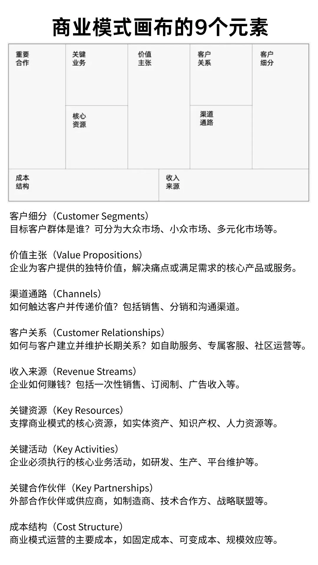 - 业务与资源(关键业务、核心资源、重要合作):你要做什么事,拥有什么(钱、人、技术、品牌),以及和谁一起做?