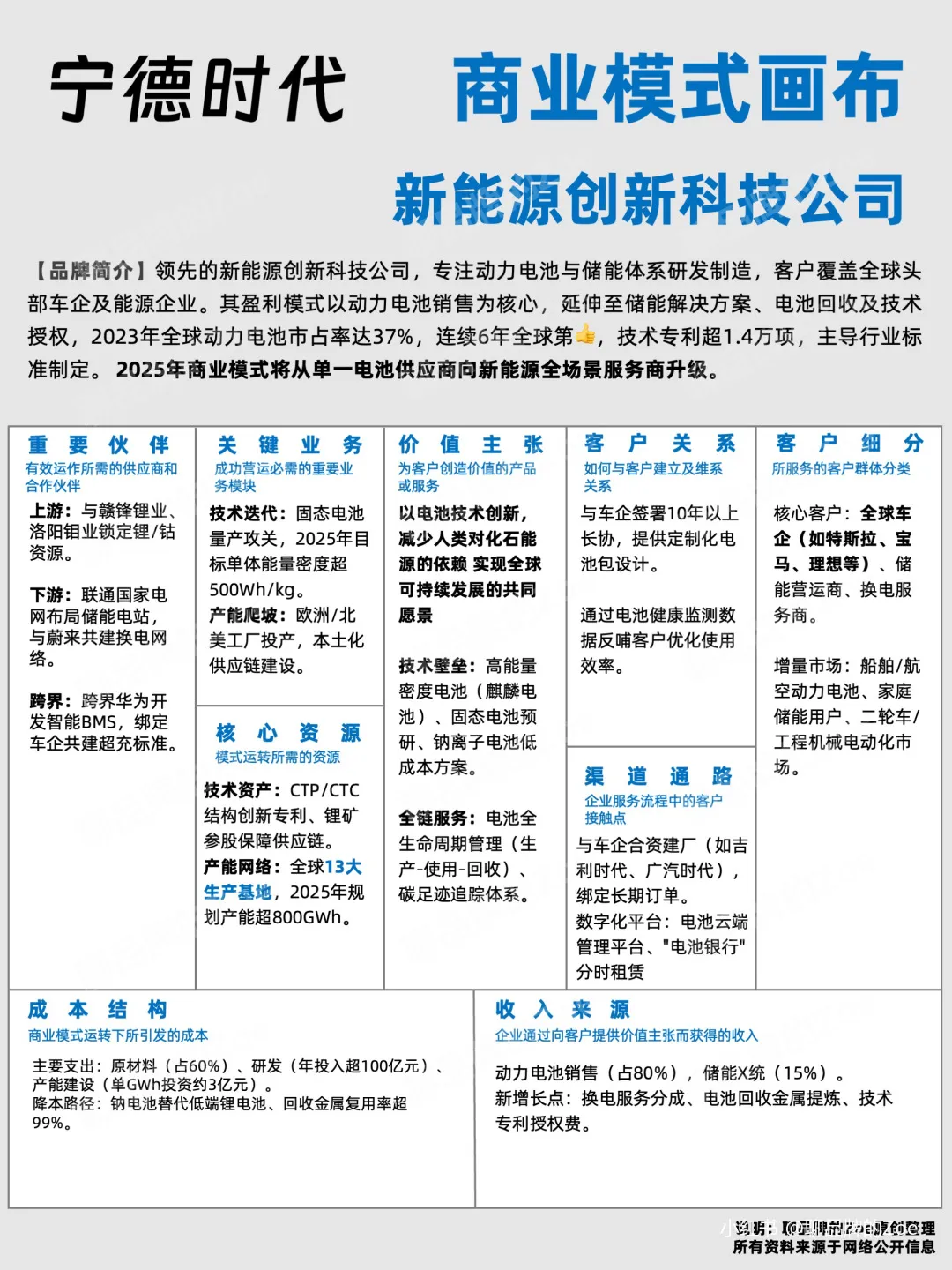我们每天与研报、数据、模型为伴,自以为对一家公司了如指掌。但当被问及“这门生意到底靠什么赚钱?”时,很多人可能会一时语塞。我们习惯于分析财务数据(营收、利润、市占率),却常常忽略支撑这些数字背后的商业逻辑。我们看到宁德时代一年赚了722亿,但很少深究这722亿究竟来自哪些业务板块,每个板块的驱动力是什么,未来哪个才是真正的增长引擎。商业模式画布(Business Model Canvas, BMC),就是那个能帮我们穿透数据迷雾,看清一家公司“骨骼”的工具。它将一家公司的生存法则,拆解为九个清晰的模块。商业模式画布由九个关键模块构成,它们共同定义了公司如何创造价值、传递价值和获取价值。- 客户与价值(客户细分、价值主张):你的用户是谁?你为他们解决了什么根本问题?