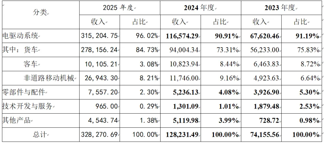 报告期内(2023年、2024年、2025年),公司主营业务收入分别为74,155.56万元、128,231.49万元和328,270.69万元,呈现快速增长态势。其中,电驱动系统是公司核心收入来源,报告期内收入占比分别为91.19%90.91%96.02%,且以货车用电驱动系统为主,2025年货车用产品收入占比达84.73%;零部件与配件、技术开发与服务及其他产品收入占比较小,整体收入结构较为集中。