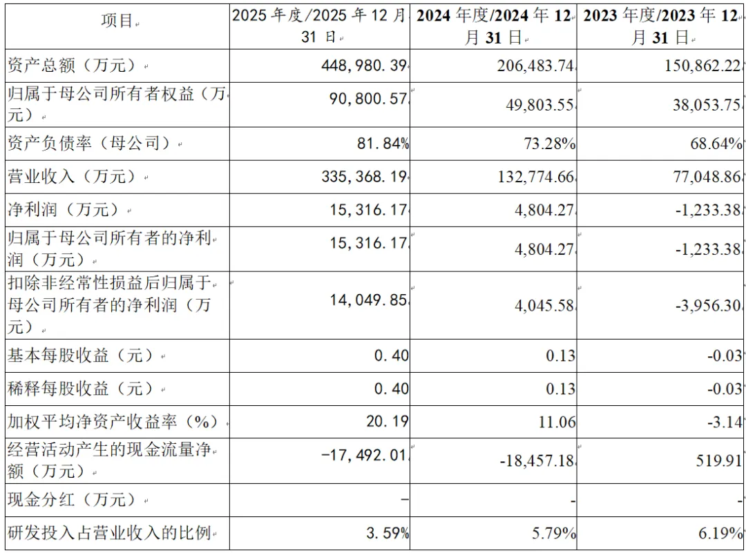 净利润方面,公司实现扭亏为盈并持续增长,2023年净利润为-1,233.38万元,2024年转为盈利4,804.27万元,2025年进一步增长至15,316.17万元;归属于母公司所有者的净利润与净利润变动趋势一致,分别为-1,233.38万元、4,804.27万元和15,316.17万元;扣除非经常性损益后归属于母公司所有者的净利润分别为-3,956.30万元、4,045.58万元和14,049.85万元,盈利能力持续改善。
