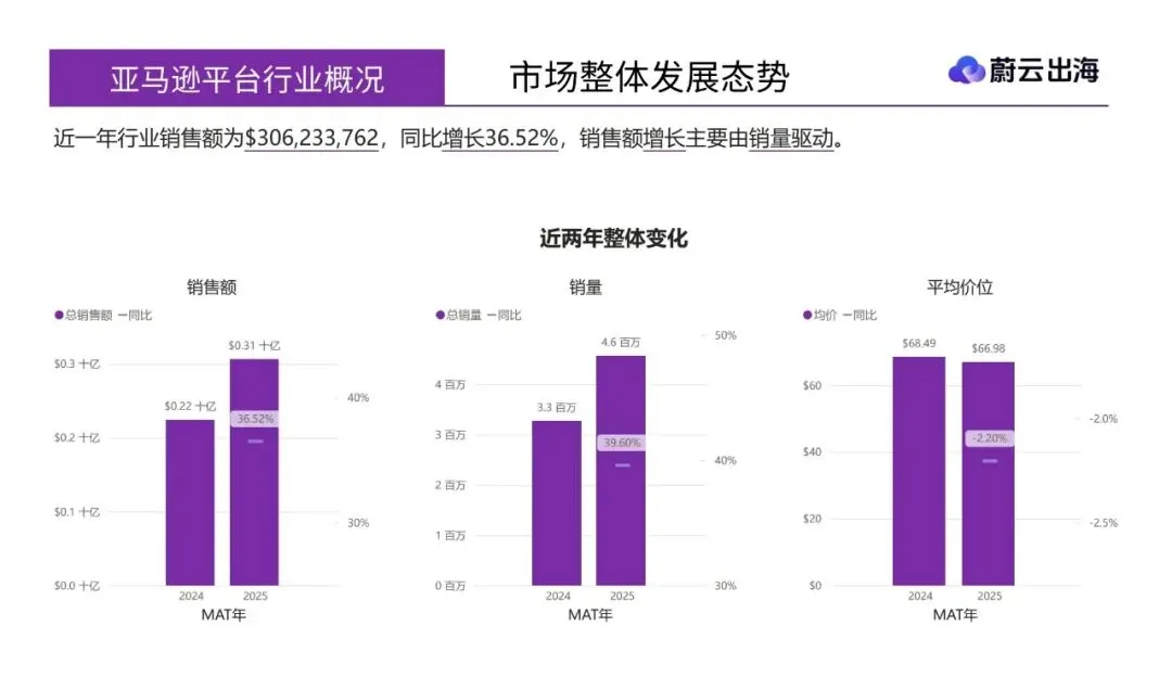 - 销售额与销量增长:近一年行业销售额为$306,233,762,同比增长36.52%,主要由销量驱动。