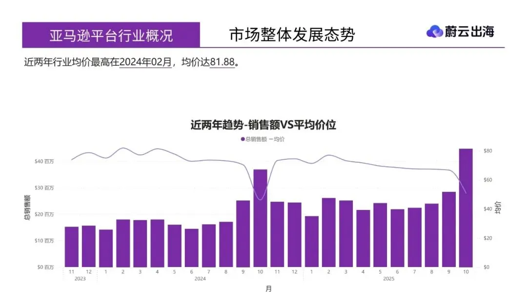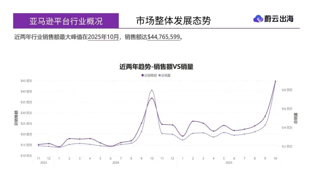 - 月度峰值表现:近两年行业销售额最大峰值出现在2025年10月,达$44,765,599。